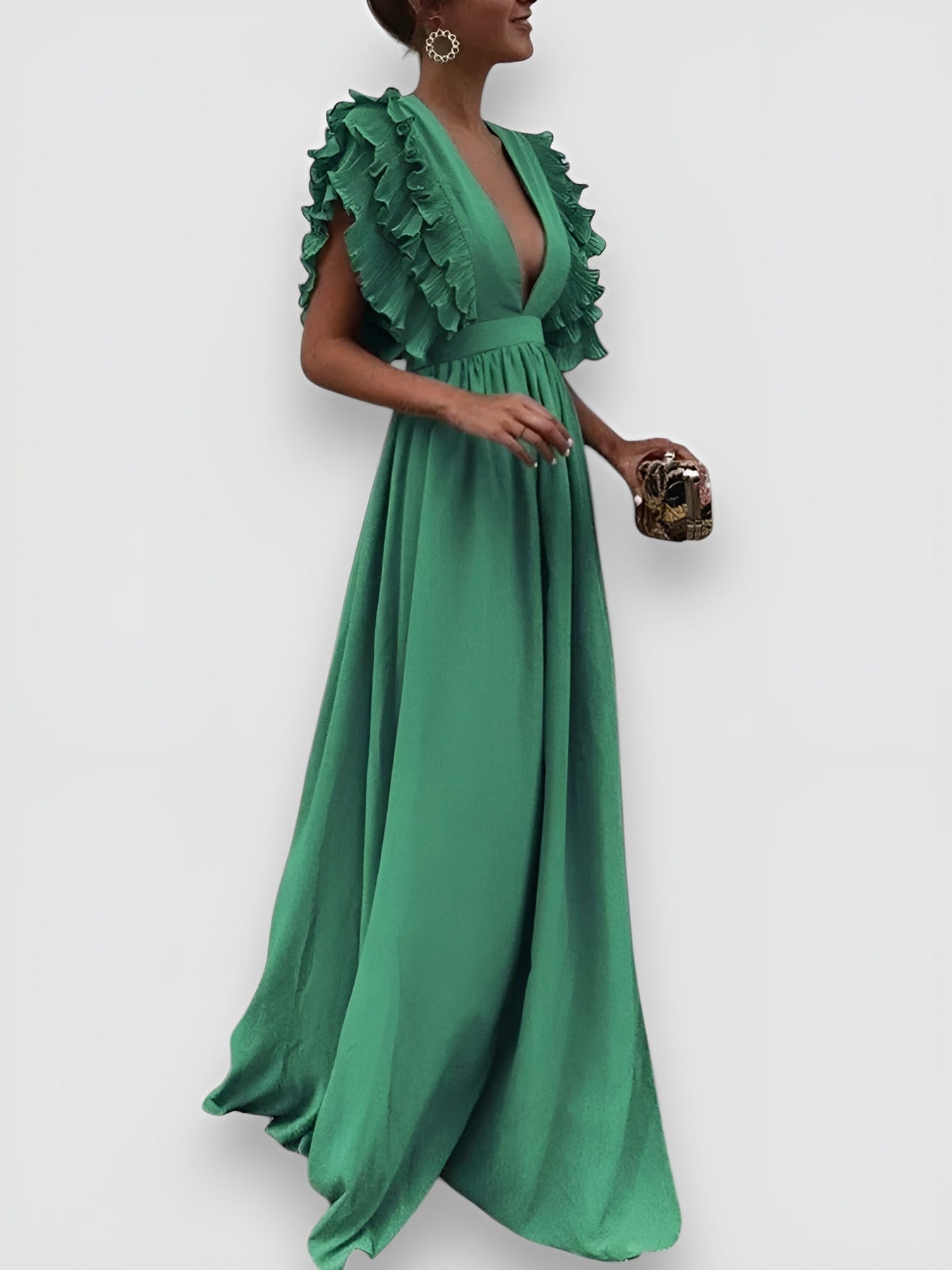 Aggiungi un tocco di raffinatezza al tuo guardaroba con l'abito Ginevra. Questo elegante abito con scollo a V ha una vestibilità leggera che è sia elegante che comoda. Perfetto per ogni occasione, da una cena a una festa elegante.
